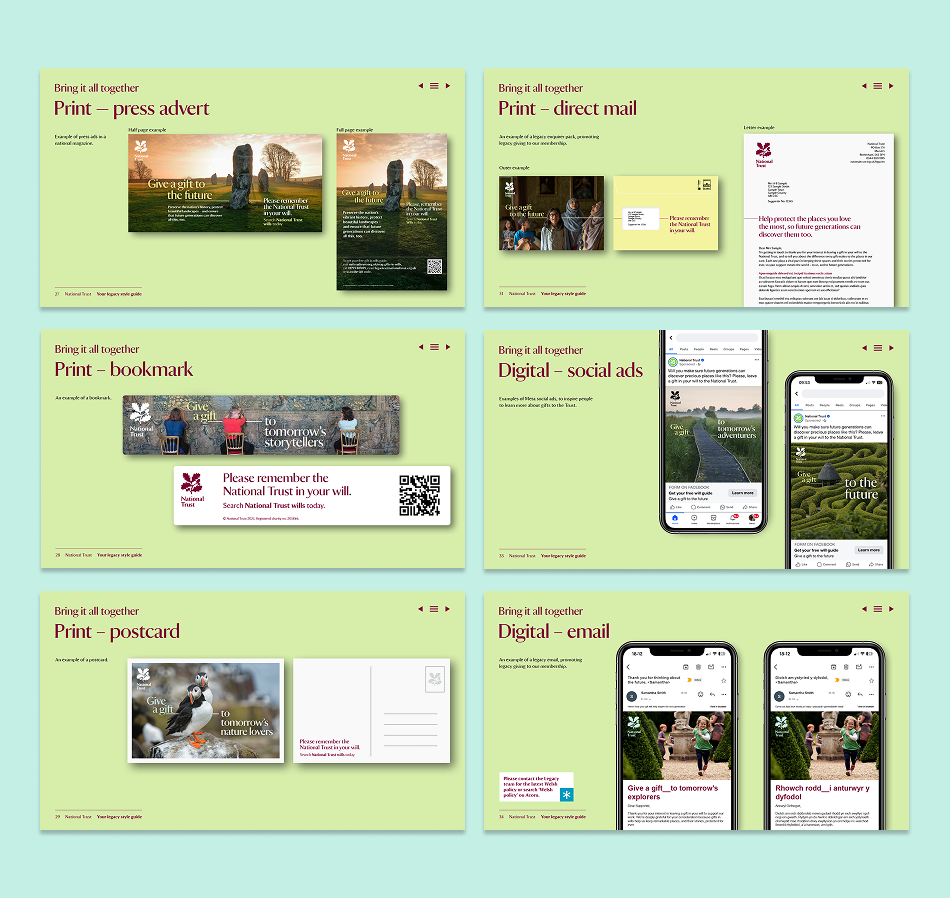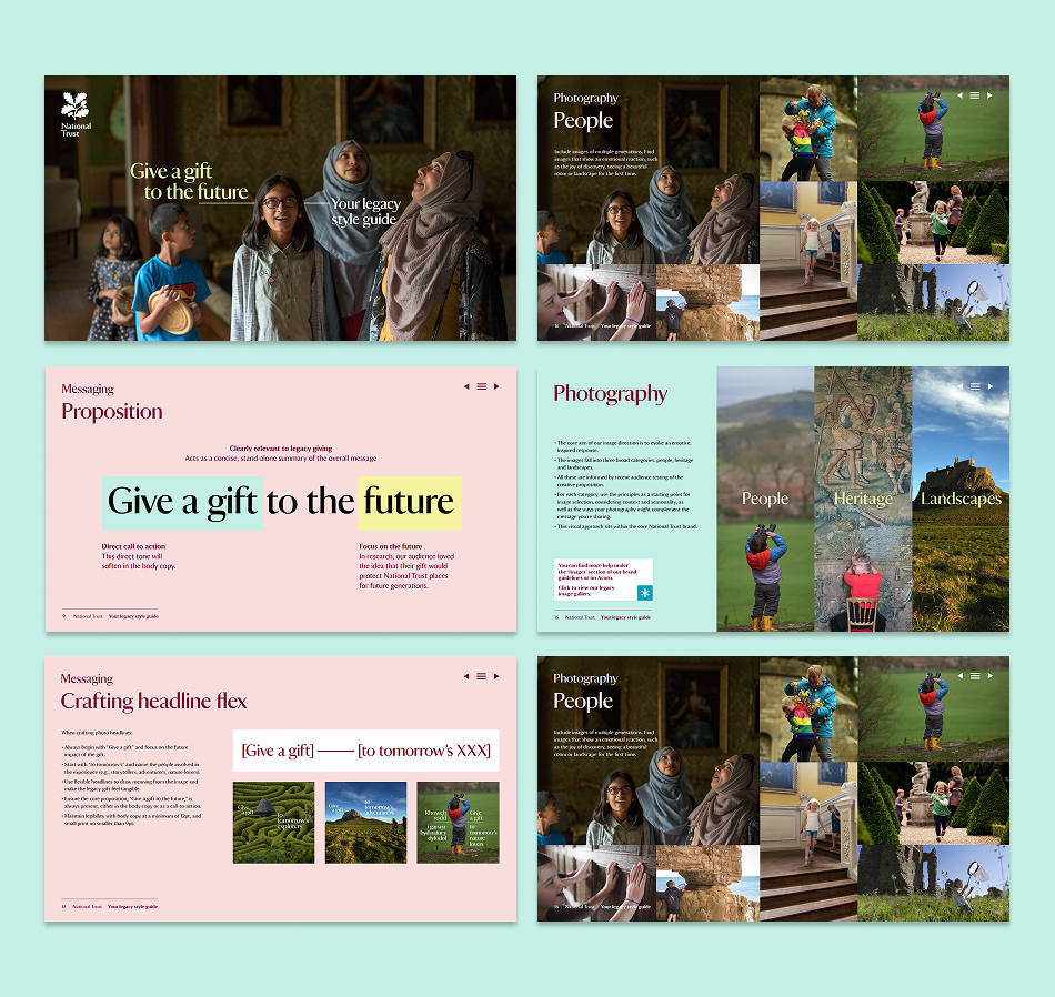 Alongside this, we developed a photographic direction and visual approach. Through images carefully chosen to evoke an experience of place and a graphic device that shows how a legacy gift connects past to future, we built a style guide that will support the National Trust’s legacy marketing for years to come.